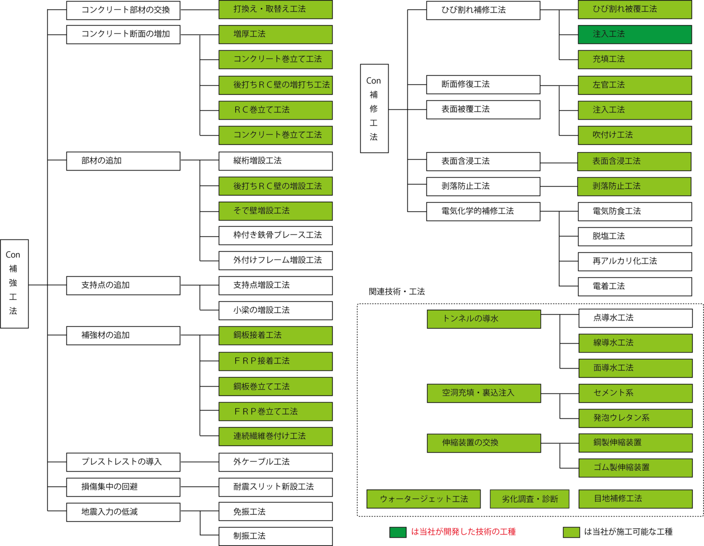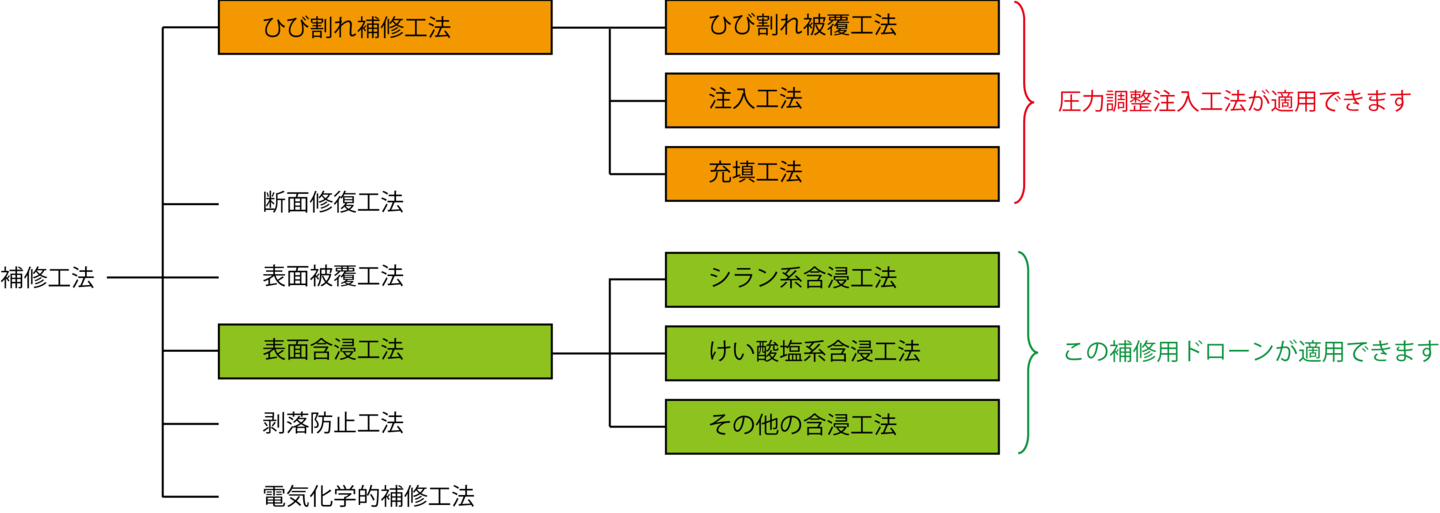 トップページ | コンクリートの補修・補強 コンクリートの補修・補強施工 施工対応工種 緑枠の工種が、当社が施工を行います 栄組独自技術の適用工種 ひび割れ注入装置と噴霧ドローン 橙枠の工種と黄緑枠の工種に当社開発の技術が適用となります