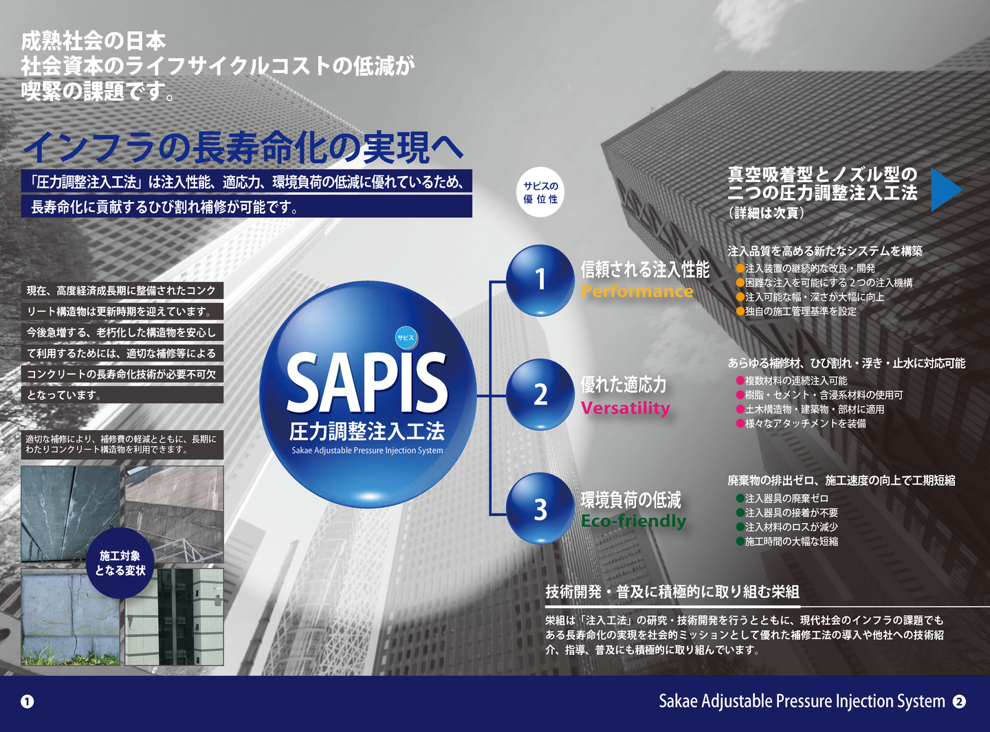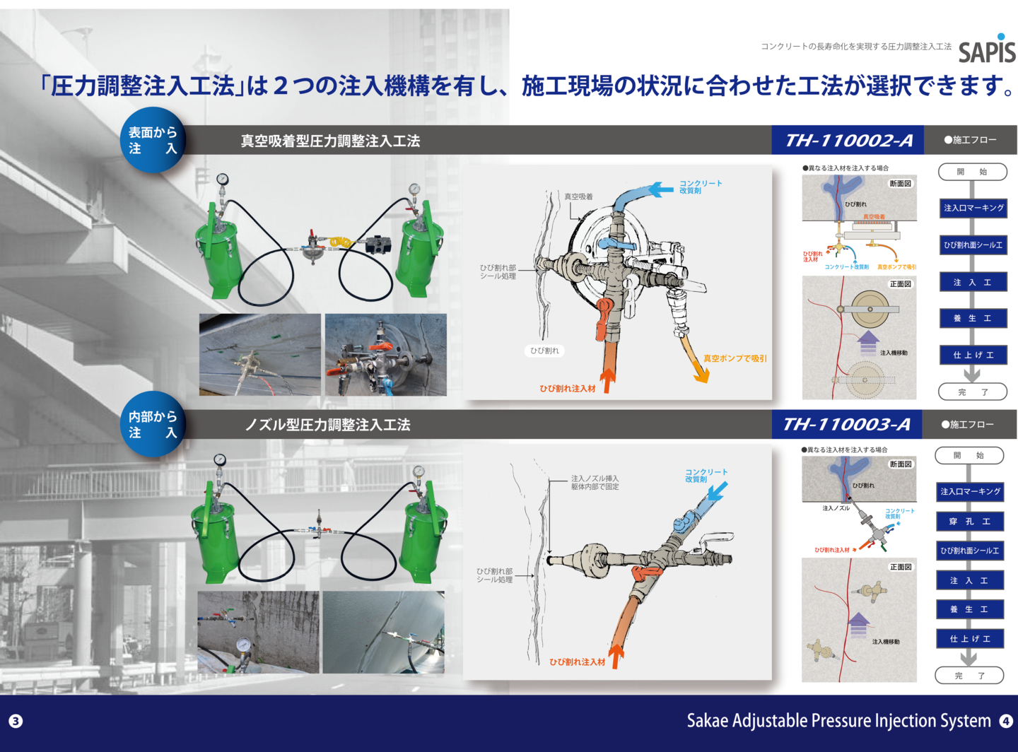 圧力調整注入工法(SAPIS)は、注入性能、補修材適応力、経済効率に優れた画期的なコンクリートのひび割れ注入工法です。 この工法は、低圧から高圧まで注入圧力を自由に調整することにより、有機系から無機系まで多様な補修材料を、ひび割れの深部から表面部まで的確に注入することを可能にしました。