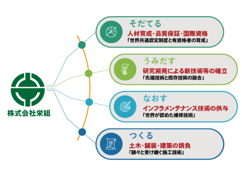 私たちは、「つくる、なおす、うみだす、そだてる」の4つの行動指針を業務の核に、社会に貢献する活動を行います。